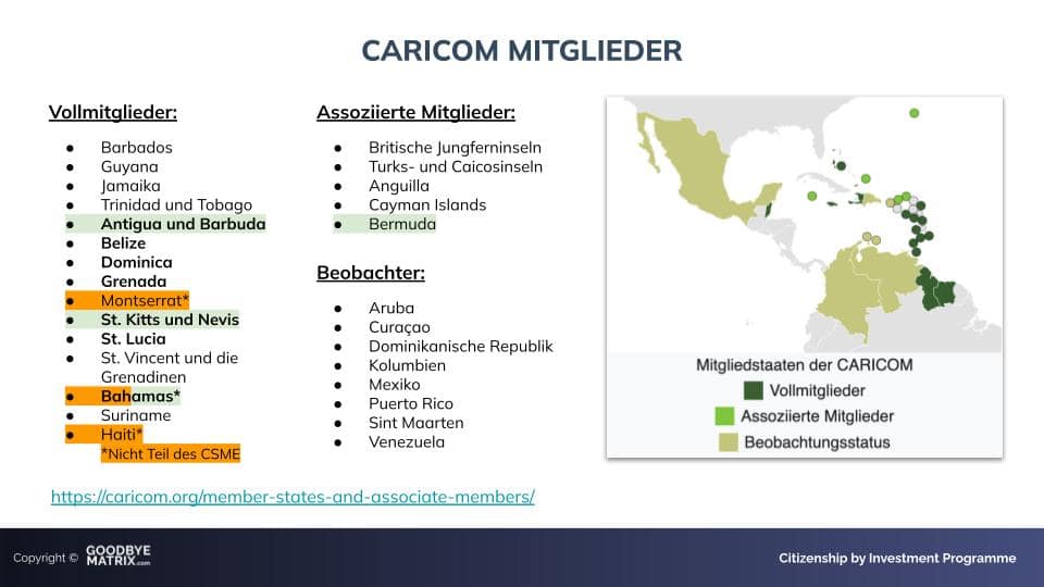 Du besitzt jedoch die Option, Dich jederzeit in dem Land oder in der Region niederlassen. Schon heute genießt Du in sieben Ländern der Ostkaribik Freizügigkeit, die auf die meisten Staaten der CARICOM ausgeweitet werden soll.