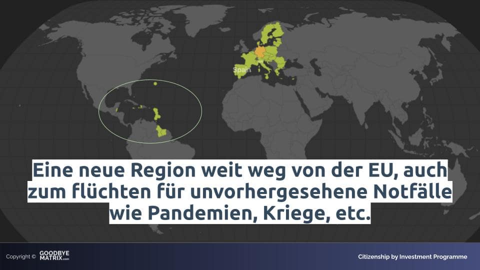 So kannst Du schnell vor unvorhergesehenen Notfällen wie Pandemien, Kriegen und oder neuen Freiheitseinschränkungen in der EU flüchten. Als Firewall liegt ein ganzer Ozean zwischen den beiden Blöcken.