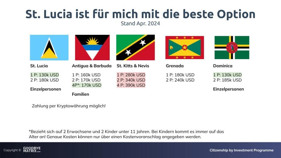 Die Entscheidung fiel in der Vergangenheit mit einer anderen Preisstruktur, in welcher Dominica & St. Lucia die günstigste Option war für Einzelantragssteller.