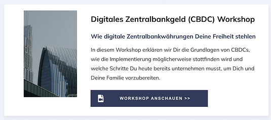 Im Workshop erfährst Du die Tücken hinter digitalen Zentralbankwährungen (CBDC) wie den E-Euro und wie Du Dich heute bereits auf diesen Trend vorbereiten kannst.