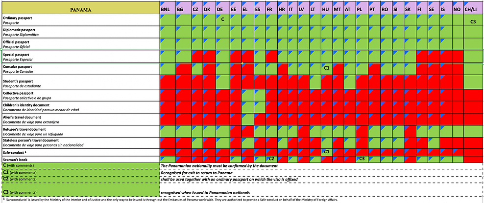 Beispielsweise erkennt Deutschland (DE) den Panama-Reisepass (Sonderpass / Special Passport in der Tabelle) an, Frankreich (FR) hingegen nicht. Wenn Du also nach Frankreich reisen möchtest, fliegst Du einfach nach Deutschland und nimmst dann den Zug oder einen EU-Inlandsflug nach Frankreich.