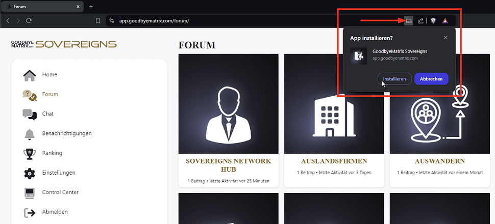Die GoodbyeMatrix Sovereigns App ist eine Progressive Web App (PWA) und funktioniert auf allen gängigen Geräten wie iOS, Android, Windows PC und Mac. Du kannst sie über den Internet-Browser aufrufen und installieren – ganz ohne den Umweg über den App Store. In Zukunft wird die App aber auch in den App Stores gelistet sein.
