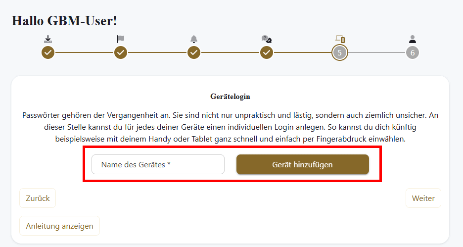 Nach dem erfolgreichen Login wird Dir ein einfacher und intuitiver Schritt-für-Schritt-Konfigurationsassistent angezeigt, in dem Du das Einloggen über Fingerabdruck / Face-ID aktivieren kannst.