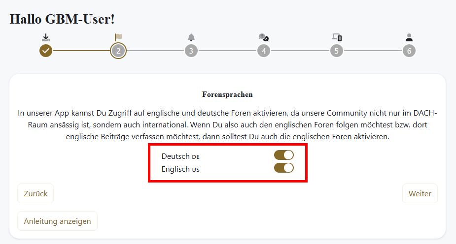 Diese Einstellungen regeln, welche Beiträge Dir angezeigt werden. Wenn Du beispielsweise die englische Sprache deaktivierst, werden Dir keine englischen Beiträge angezeigt. Daher empfehlen wir, beide Sprachen aktiviert zu lassen.