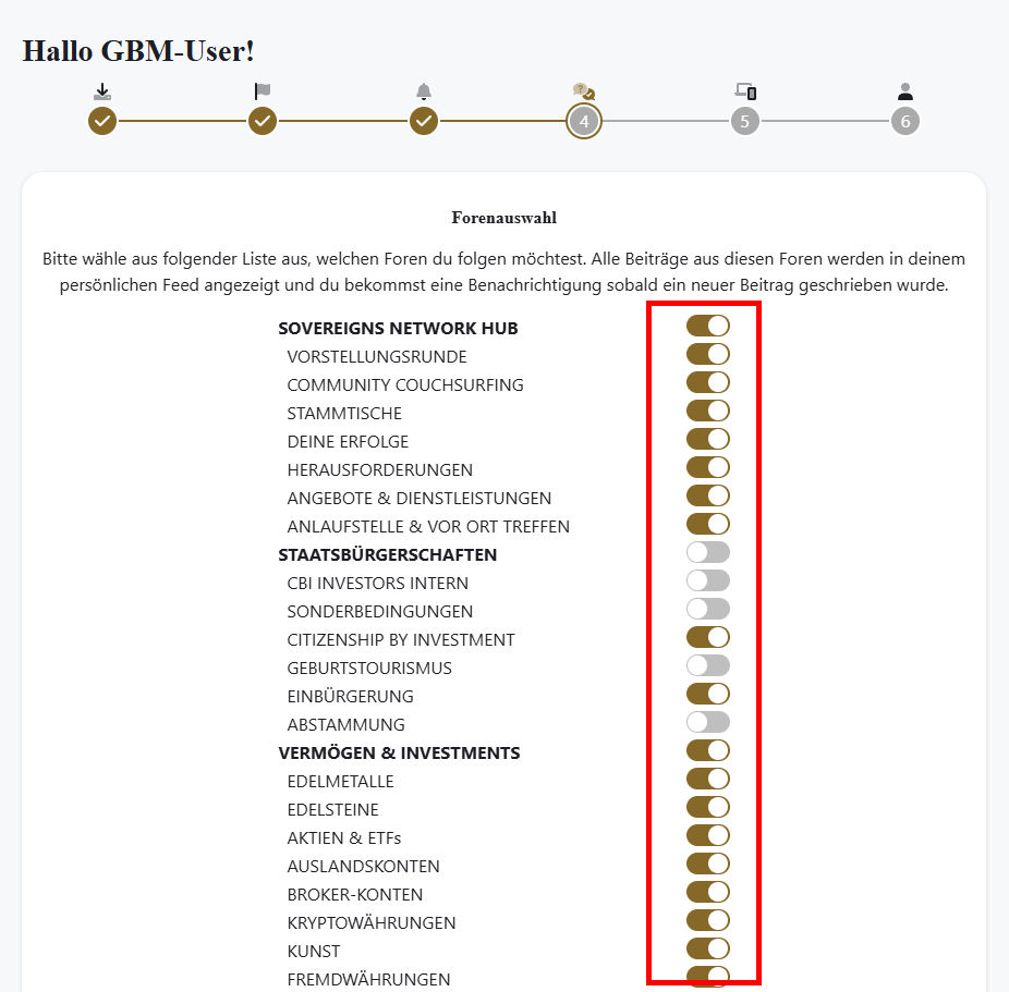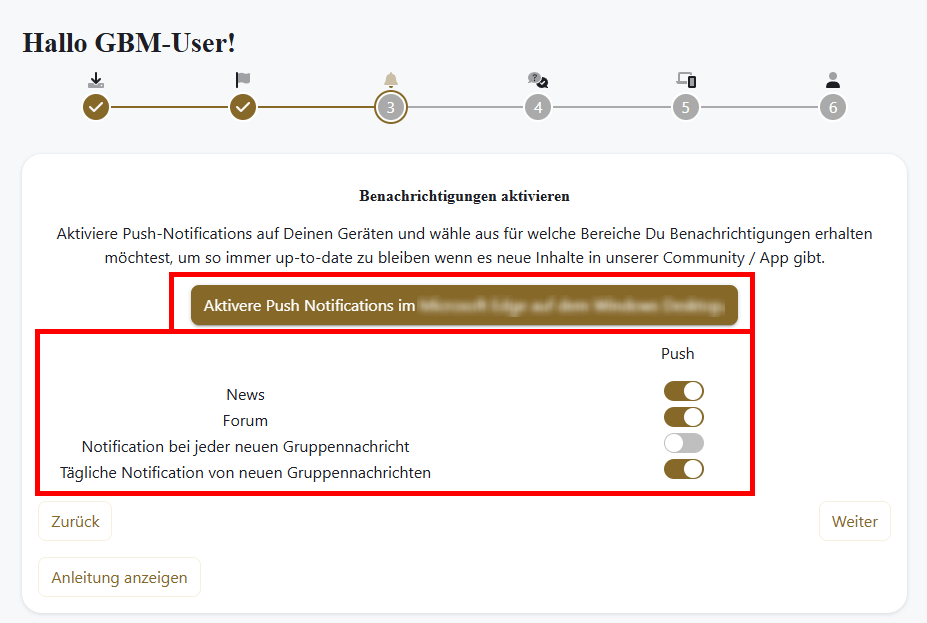 In diesem Schritt kannst Du alle Themen/Foren aktivieren, die Dich interessieren. So werden Dir neue Beiträge oder Kommentare zu diesen Themen in Deinem Feed auf der Startseite angezeigt und Dir eine Push-Benachrichtigung (Schritt 3) auf Dein Gerät gesendet. Damit bleibst Du stets auf dem Laufenden über alle für Dich relevanten Themen!