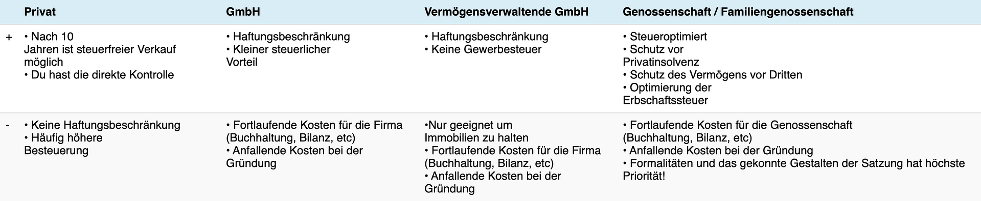 Genau deswegen habe ich mir die Mühe gemacht Dir die Vor- und Nachteile von 4 Rechtsformen in Deutschland für die Verwaltung von Immobilien gegenüberzustellen: