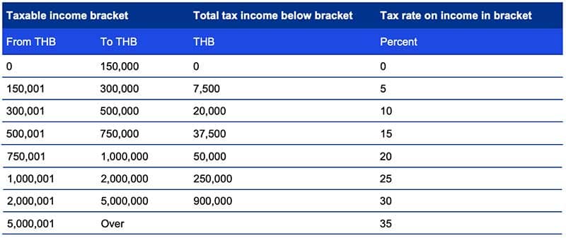 Income tax rates in Thailand range from 0% to 35%, depending on the amount of taxable income.